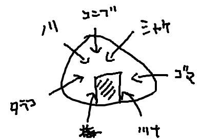 むちゃくちゃおにぎりとは図のごとく、ボクの好きなおにぎりの具を全部いっぺんにつめこんだ